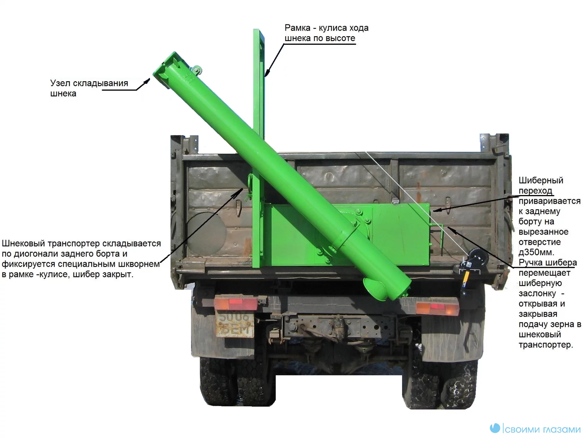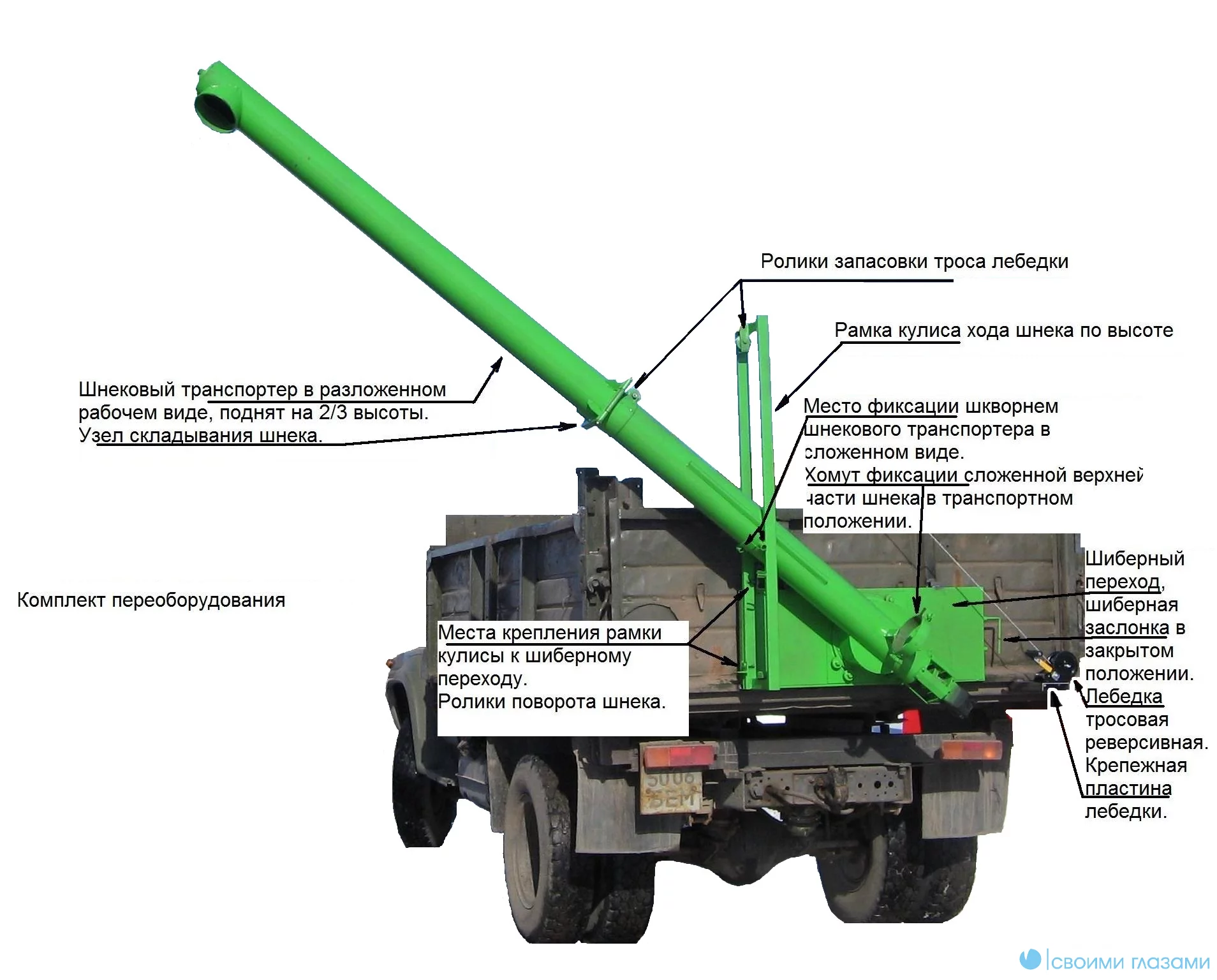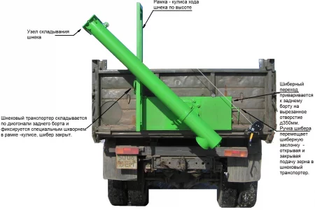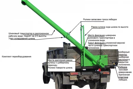 Комплект переоборудования загрузчика сеялок ЗС представляет собой универсальную полнокомплектную модель загрузчика сеялок устанавливаемую на любой задний штатный борт автотракторных самосвалов. Основные узлы: шнековый транспортер, несущий шиберный переход 400 х 1200 мм, поворотный узел, направляющая рамка, реверсивная лебедка, а так же гидропривод, необходимые штуцера, рукава для подключения гидромотора и крепеж. Комплект переоборудования может быть установлен на любой штатный задний борт самосвальной техники с возможностью переустановки на любую другую технически соответствующую платформу — Вы просто вырезаете на своем штатном борту круглое отверстие диаметром 220 мм, устанавливаете шиберный переход (сварка и болтовые соединения), монтируете на него шнековый транспортер, кулису, лебедку, подключаете гидропривод согласно своей платформы и все, при необходимости его можно перенести на другую платформу, а отверстие на своем борту заглушить.