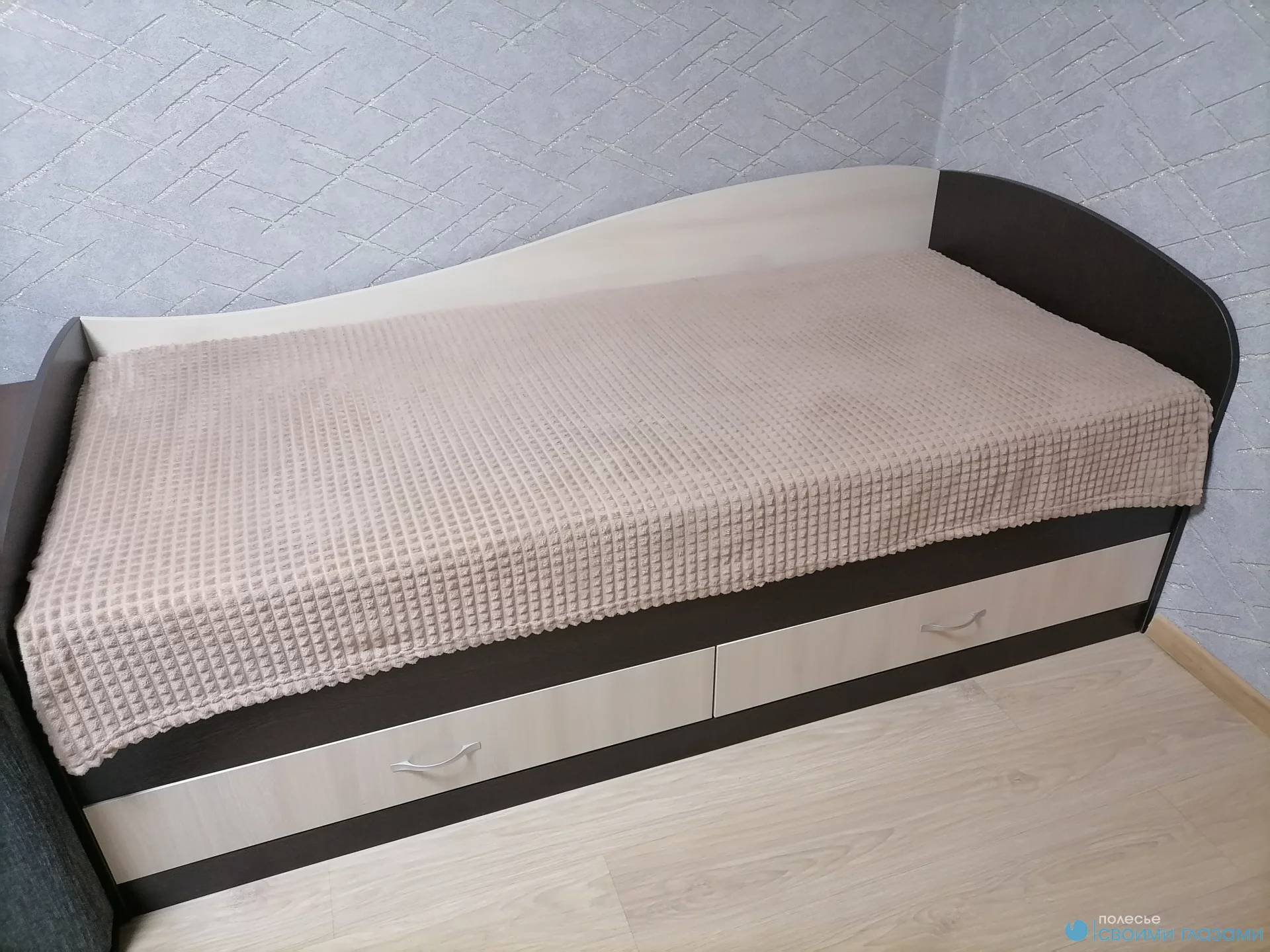 В основании кровати размещены два вместительный ящика для спальных принадлежностей. Спинка универсальная и может монтироваться на обе стороны.