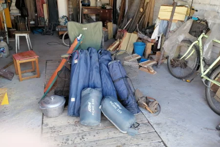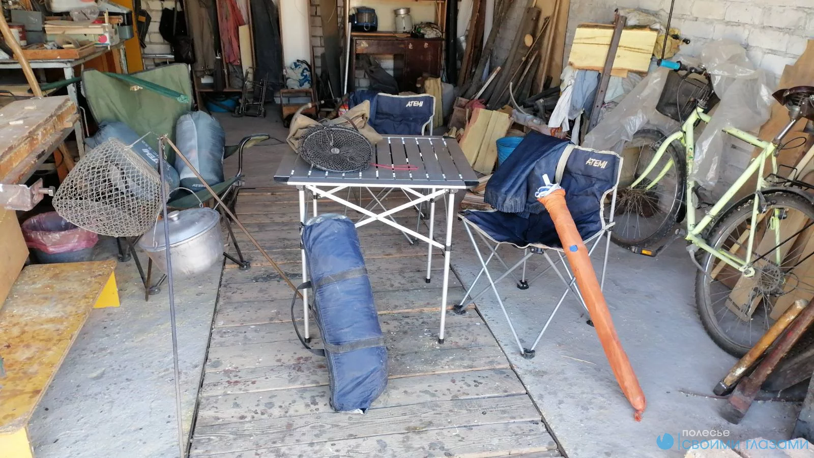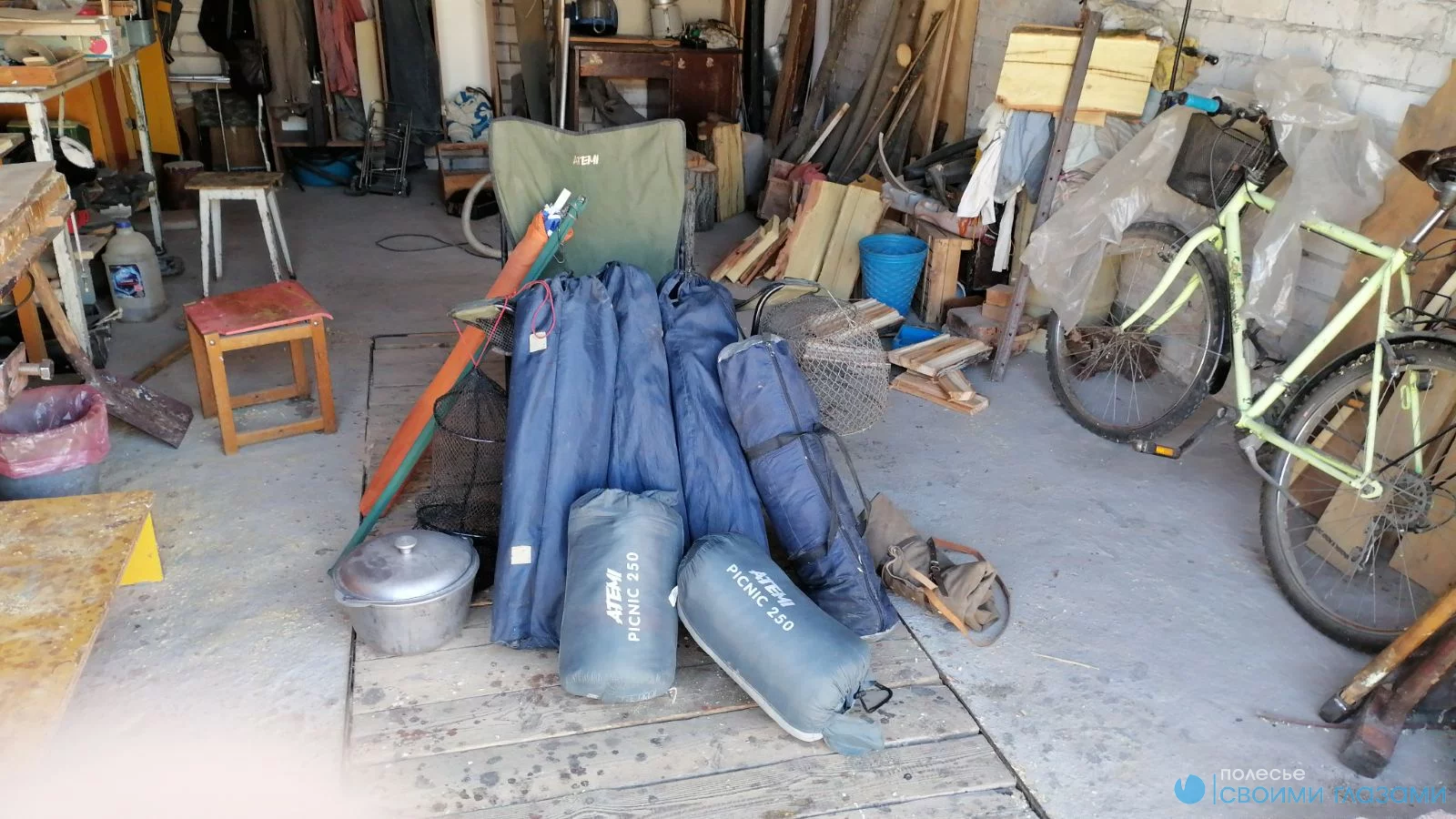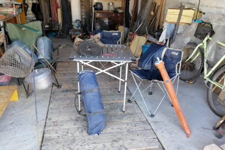 Палатка, два спальных мешка, три складных кресла, плащ-накидка, зонт от солнца, котелок для варки на треноге ,садок для рыбы.